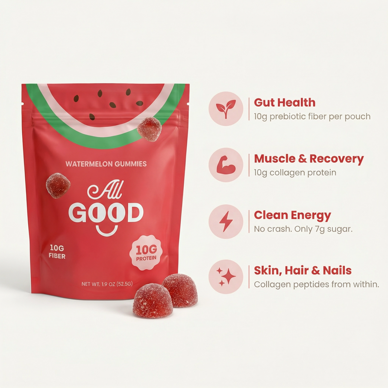 Most snacks make you choose: taste great OR be healthy. ALL GOOD doesn’t. We packed 10g of collagen protein and 10g of prebiotic fiber into a gummy that genuinely tastes like watermelon candy, with only 7g sugar and 140 calories per pouch. No chalky protein taste, no sugar-free plastic-taste. Just candy that's all good.